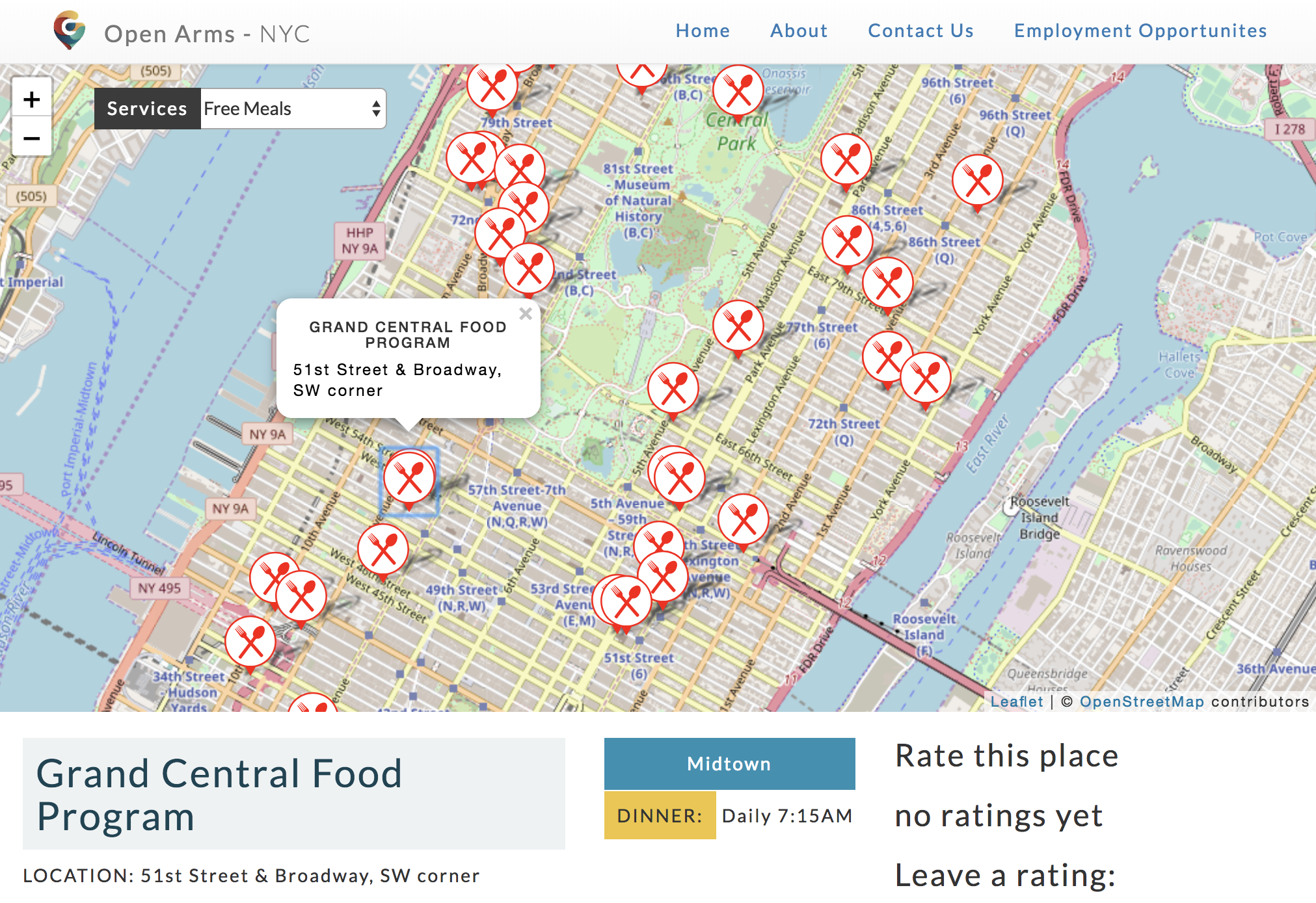 An online service that locates all free meals and homeless shelters in Manhattan. Created with Javascript, Express, PostgreSQL, React, Leaflet.js, and Bootstrap.